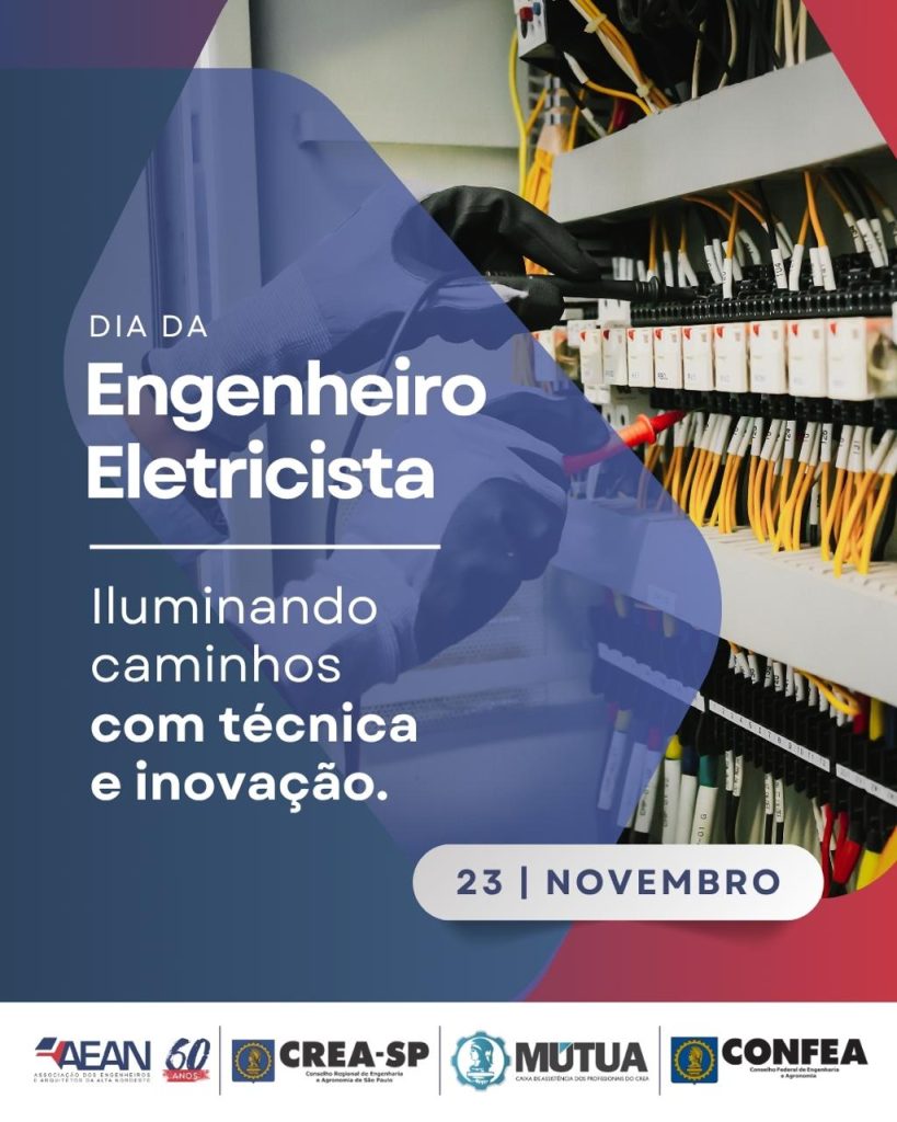 A AEAN (Associação dos Engenheiros e Arquitetos da Alta Noroeste) e o Crea-SP (Conselho Regional de Engenharia e Agronomia do Estado de São Paulo) parabenizam todos os profissionais pelo Dia do Engenheiro Eletricista, celebrado em 23 de novembro.