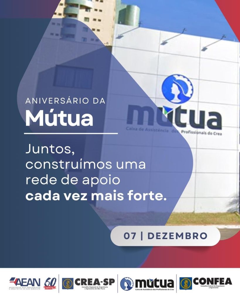 A AEAN (Associação dos Engenheiros e Arquitetos da Alta Noroeste) e o Crea-SP (Conselho Regional de Engenharia e Agronomia de São Paulo) parabenizam a Mútua por mais um aniversário.