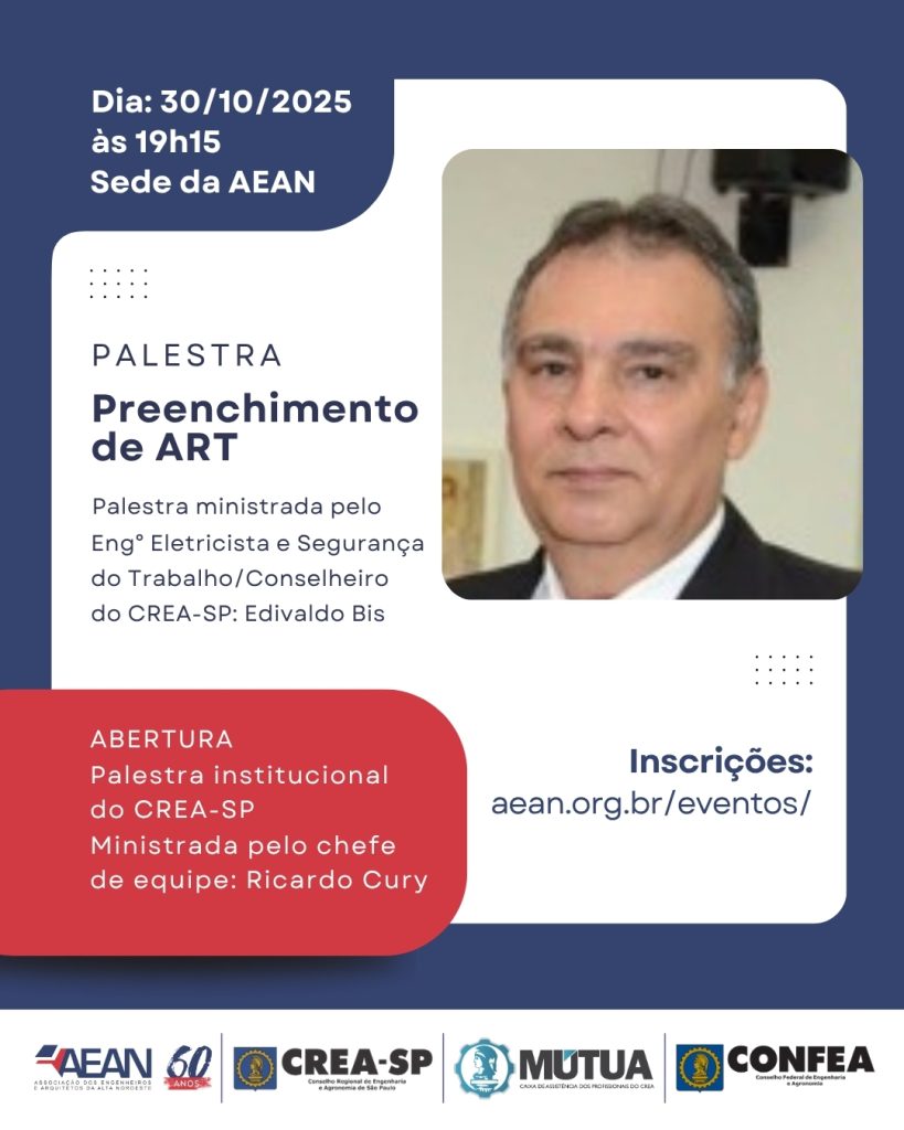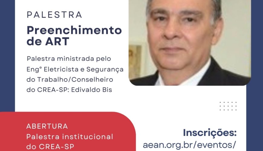 A AEAN promove, no dia 30 de outubro, às 19h15, uma palestra sobre Preenchimento de ART, com o Engenheiro Eletricista e de Segurança do Trabalho/Conselheiro do CREA-SP, Edivaldo Bis.