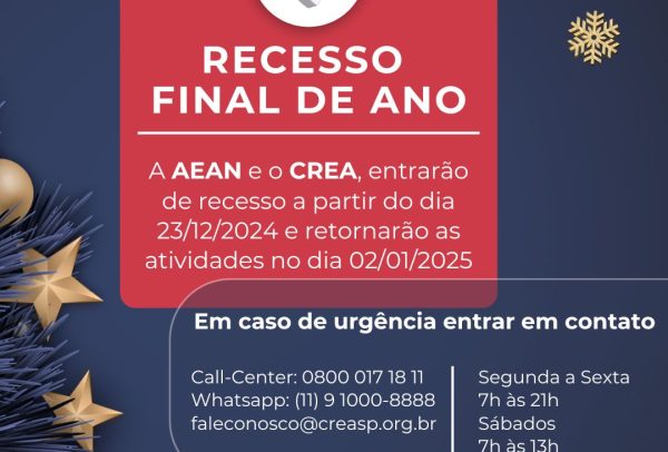 ✨ A AEAN e o CREA-SP estarão em recesso a partir do dia 23/12/2024 e retornarão às atividades no dia[…..]